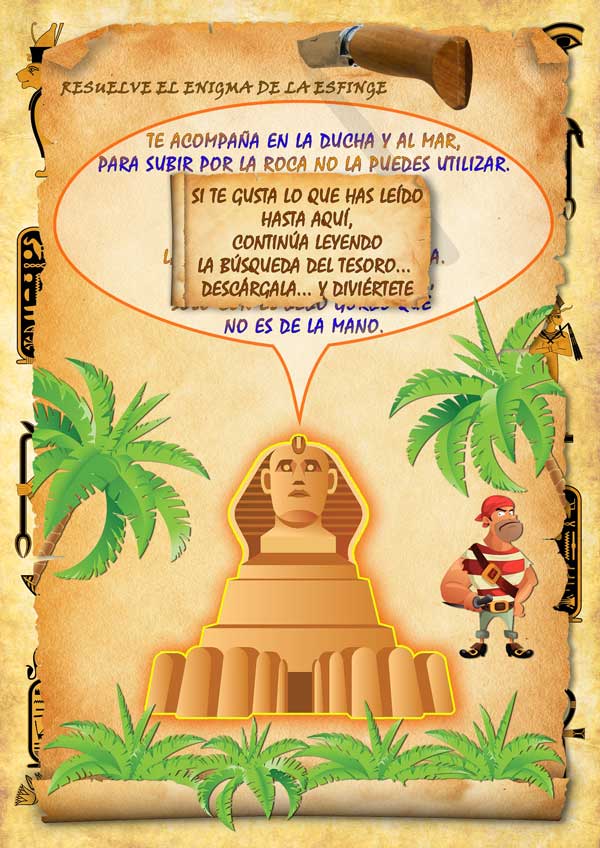 Sus hijos tendrán que solucionar los acertijos y poner las soluciones en los puntos inicados en el mapa. Las primeras letras de cada solución componen la palabra que los llevará al escondite del tesoro que podría ser su regalo de cupleaños, un sobre con dinero, caramelos, chocolate….lo que queráis. Depende de la ocasión.