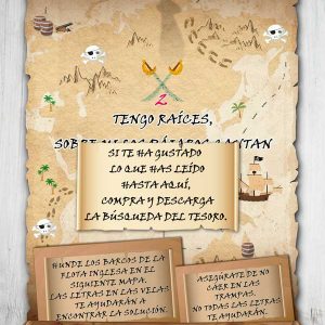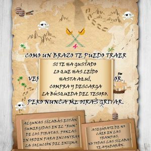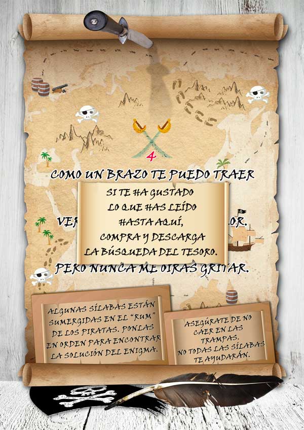 Sus hijos tendrán que solucionar los acertijos y poner las soluciones en los puntos inicados en el mapa. Las primeras letras de cada solución componen la palabra que los llevará al escondite del tesoro que podría ser su regalo de cupleaños, un sobre con dinero, caramelos, chocolate….lo que queráis. Depende de la ocasión.