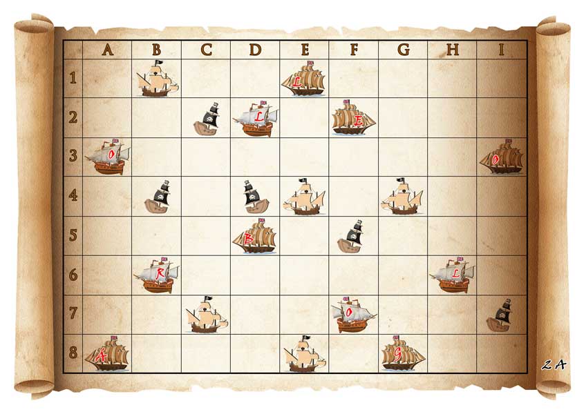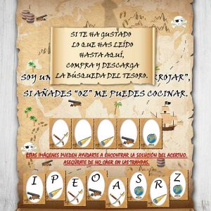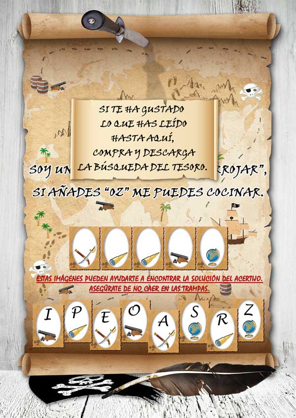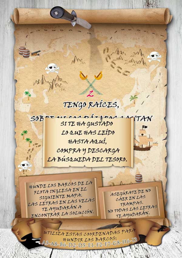 Sus hijos tendrán que solucionar los acertijos, componer puzzle y palabras, hundir barcos y poner las soluciones en los puntos inicados en el mapa. Las primeras letras de cada solución componen la palabra que los llevará al escondite del tesoro que podría ser su regalo de cupleaños, un sobre con dinero, caramelos, chocolate….lo que queráis. Depende de la ocasión.