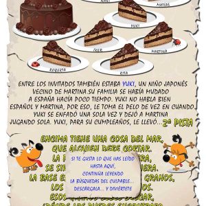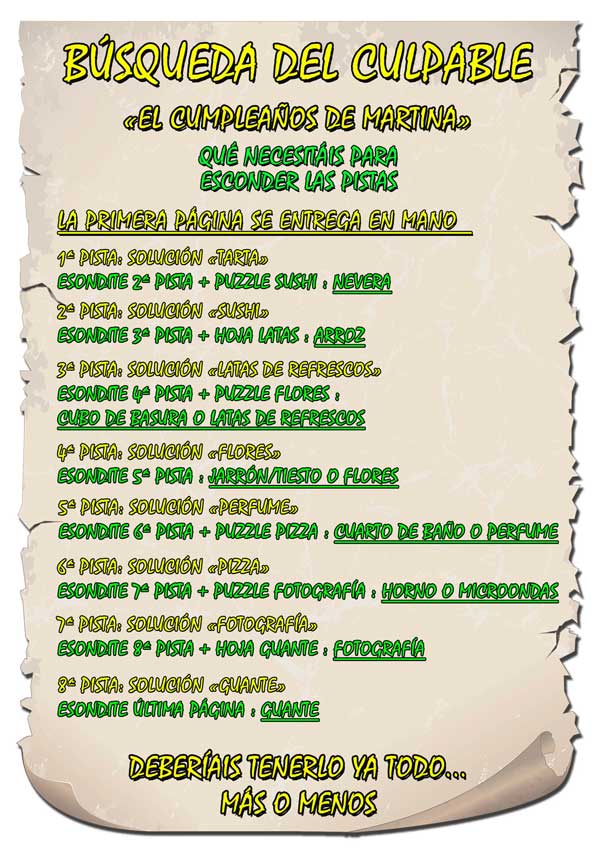 Sus hijos tendrán que solucionar los acertijos y poner las soluciones en los puntos inicados en el mapa. Las primeras letras de cada solución componen la palabra que los llevará al escondite del tesoro que podría ser su regalo de cupleaños, un sobre con dinero, caramelos, chocolate….lo que queráis. Depende de la ocasión.