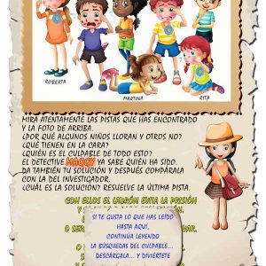 El detective Jimmy y vuestro hijo tendrán que investigar casos en los que todos son sospechosos, pero solo una persona es culpable. Deberán resolver los acertijos, componer puzzle y palabras que les llevarán a descubrir y examinar las pistas (imágenes), estudiar con atención a las personas implicadas y al final sacar conclusiones de todo lo que han descubierto y encontrar al culpable.