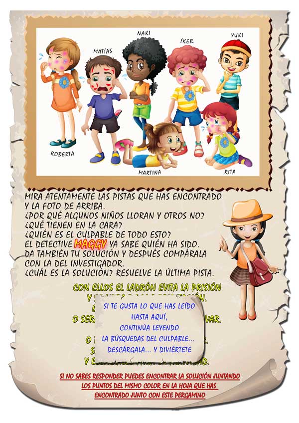 El detective Maggy y vuestro hijo tendrán que investigar casos en los que todos son sospechosos, pero solo una persona es culpable. Deberán resolver los acertijos, componer puzzle y palabras que les llevarán a descubrir y examinar las pistas (imágenes), estudiar con atención a las personas implicadas y al final sacar conclusiones de todo lo que han descubierto y encontrar al culpable.