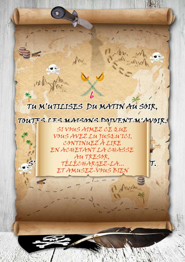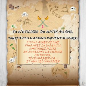 Votre enfant devra résoudre les énigmes, chercher des indices à l’intérieur ou le jardin et reporter les solutions aux points indiqués sur la carte. Les premières lettres de chaque solution forment le mot qui l’amènera à la cachette du trésor.