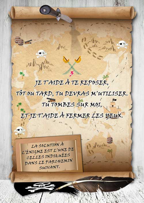 Votre enfant devra résoudre les énigmes, chercher des indices et reporter les solutions aux points indiqués sur la carte. Les premières lettres de chaque solution forment le mot qui l'amènera à la cachette du trésor.