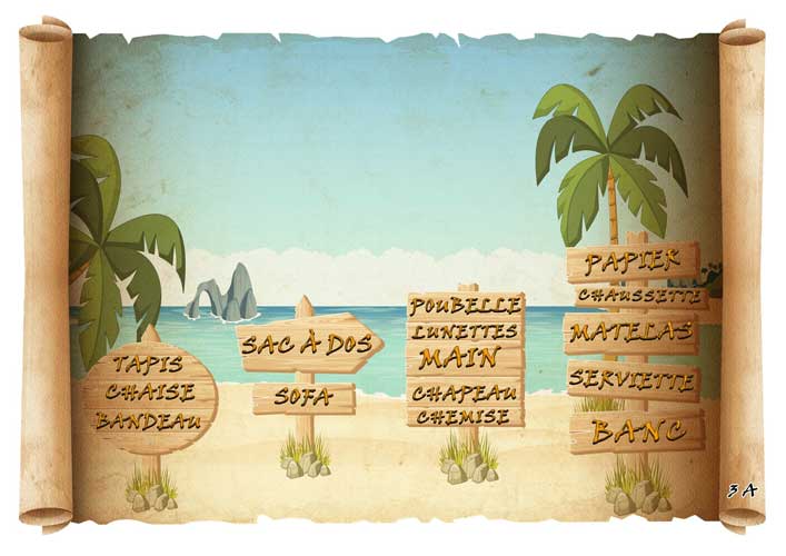 Devinettes : Vélo – Trou – Papier de toilette - Niche du chien - Fleurs - Bois - Parasol - Balai - Ballon – Chaise longue – Seau - Chaise - Table -Étendoir/sèche-linge - Arbre - Pot de fleurs