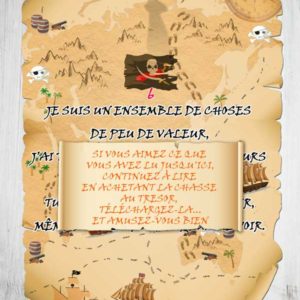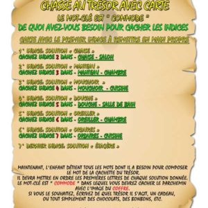 Votre enfant devra résoudre les énigmes, chercher des indices à l’intérieur ou le jardin et reporter les solutions aux points indiqués sur la carte. Les premières lettres de chaque solution forment le mot qui l’amènera à la cachette du trésor.