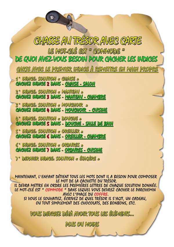 Votre enfant devra résoudre les énigmes, chercher des indices à l'intérieur ou le jardin et reporter les solutions aux points indiqués sur la carte. Les premières lettres de chaque solution forment le mot qui l'amènera à la cachette du trésor.