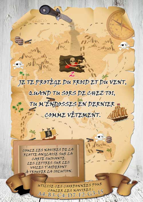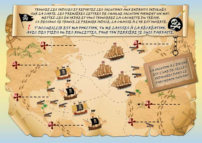 Votre enfant devra résoudre les énigmes, chercher des indices et reporter les solutions aux points indiqués sur la carte. Les premières lettres de chaque solution forment le mot qui l'amènera à la cachette du trésor.