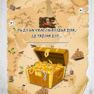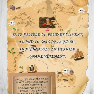 Votre enfant devra résoudre les énigmes, chercher des indices à l’intérieur ou le jardin et reporter les solutions aux points indiqués sur la carte. Les premières lettres de chaque solution forment le mot qui l’amènera à la cachette du trésor.