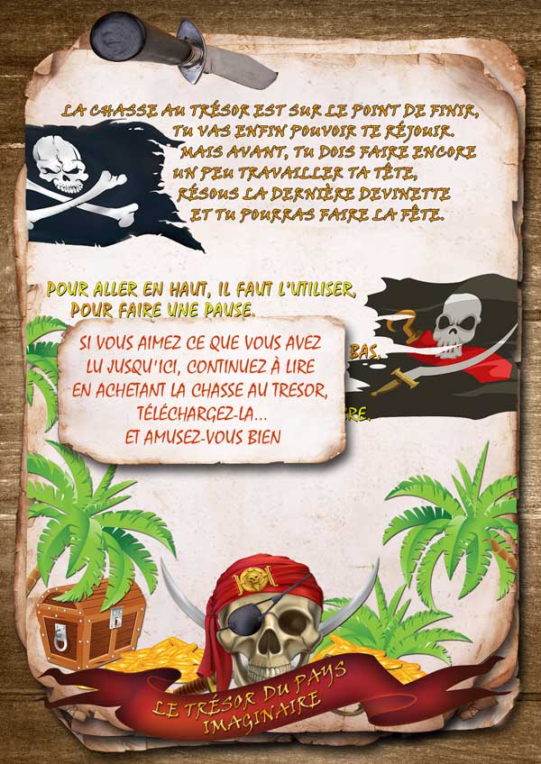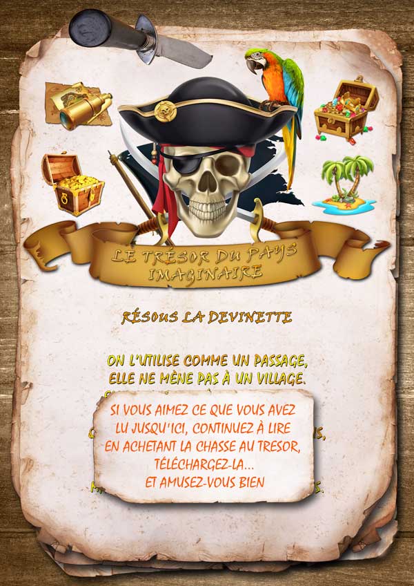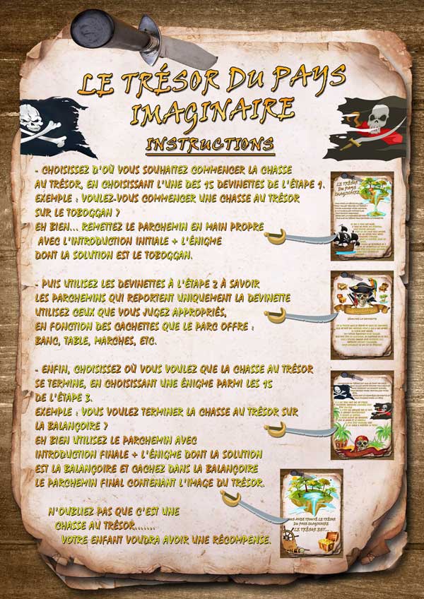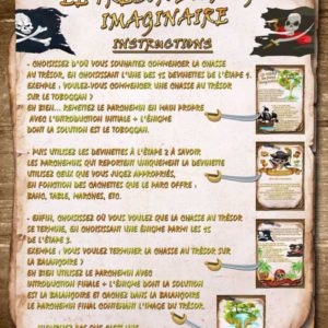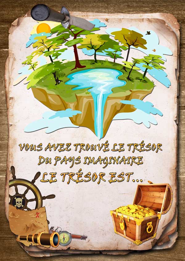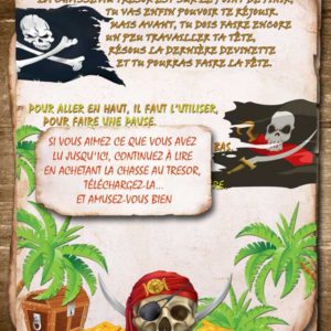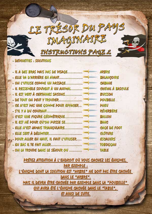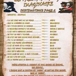 Votre enfant devra résoudre les énigmes, chercher des indices et reporter les solutions aux points indiqués sur la carte. Les premières lettres de chaque solution forment le mot qui l'amènera à la cachette du trésor.