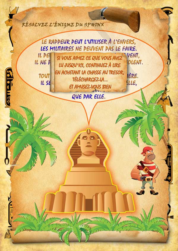 Votre enfant devra résoudre les énigmes, chercher des indices et reporter les solutions aux points indiqués sur la carte. Les premières lettres de chaque solution forment le mot qui l'amènera à la cachette du trésor.