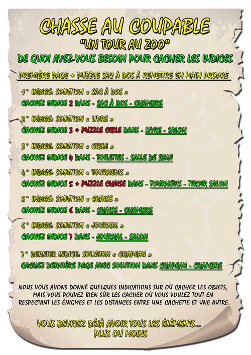 Votre enfant devra résoudre les énigmes, chercher des indices à l'intérieur ou le jardin et reporter les solutions aux points indiqués sur la carte. Les premières lettres de chaque solution forment le mot qui l'amènera à la cachette du trésor.