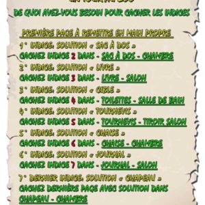 Votre enfant devra résoudre les énigmes, chercher des indices à l'intérieur ou le jardin et reporter les solutions aux points indiqués sur la carte. Les premières lettres de chaque solution forment le mot qui l'amènera à la cachette du trésor.