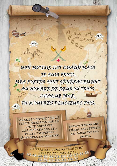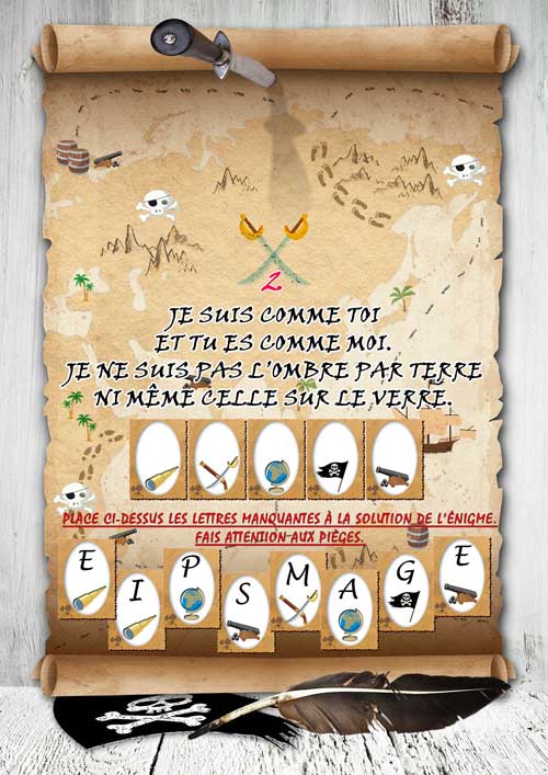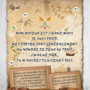 Votre enfant devra résoudre les énigmes, chercher des indices et reporter les solutions aux points indiqués sur la carte. Les premières lettres de chaque solution forment le mot qui l'amènera à la cachette du trésor.