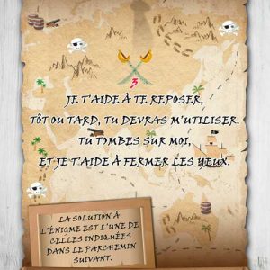 Votre enfant devra résoudre les énigmes, chercher des indices à l’intérieur ou le jardin et reporter les solutions aux points indiqués sur la carte. Les premières lettres de chaque solution forment le mot qui l’amènera à la cachette du trésor.
