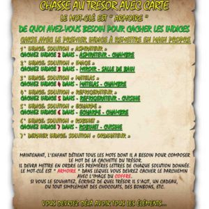 Votre enfant devra résoudre les énigmes, chercher des indices à l’intérieur ou le jardin et reporter les solutions aux points indiqués sur la carte. Les premières lettres de chaque solution forment le mot qui l’amènera à la cachette du trésor.