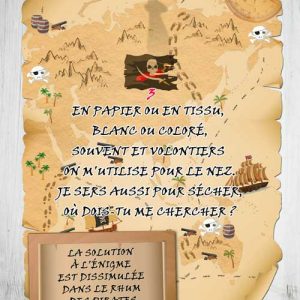 Votre enfant devra résoudre les énigmes, chercher des indices à l’intérieur ou le jardin et reporter les solutions aux points indiqués sur la carte. Les premières lettres de chaque solution forment le mot qui l’amènera à la cachette du trésor.