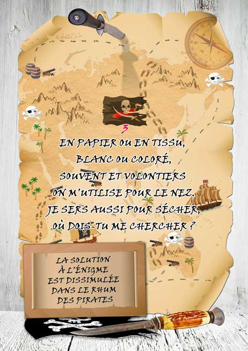 Votre enfant devra résoudre les énigmes, chercher des indices et reporter les solutions aux points indiqués sur la carte. Les premières lettres de chaque solution forment le mot qui l'amènera à la cachette du trésor.