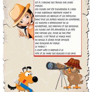 Tout cela à travers la lecture d’une histoire, d’énigmes simples et amusantes et d’images qui sont autant d’indices nécessaires pour résoudre l’affaire.