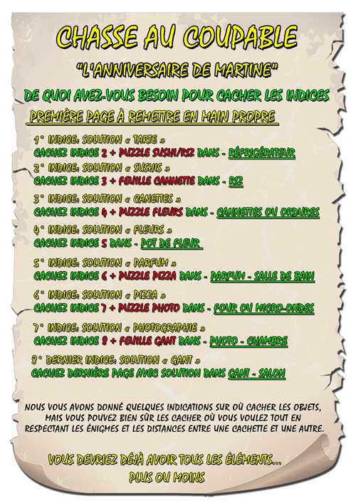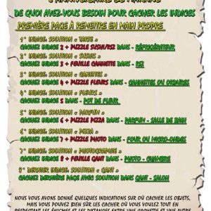 Votre enfant devra résoudre les énigmes, chercher des indices à l'intérieur ou le jardin et reporter les solutions aux points indiqués sur la carte. Les premières lettres de chaque solution forment le mot qui l'amènera à la cachette du trésor.