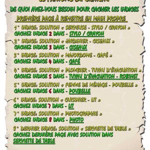 Votre enfant devra résoudre les énigmes, chercher des indices à l'intérieur ou le jardin et reporter les solutions aux points indiqués sur la carte. Les premières lettres de chaque solution forment le mot qui l'amènera à la cachette du trésor.