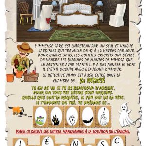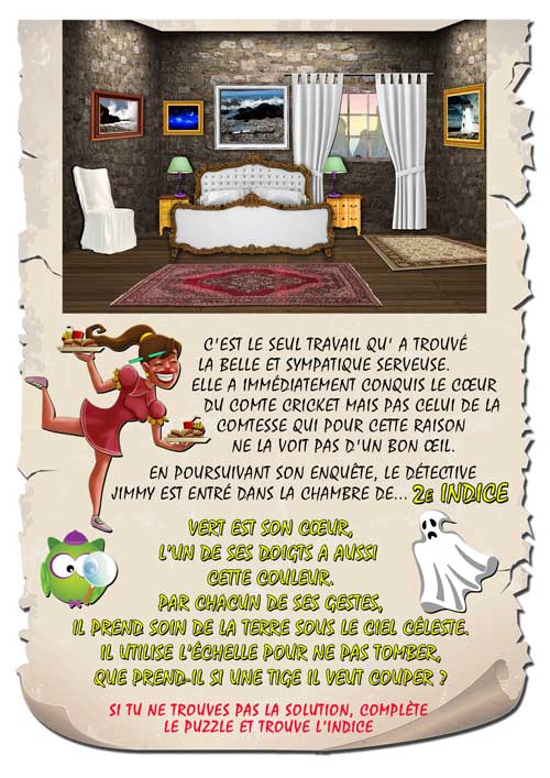 Une visite au château des comtes crickets s'est transformé en un après-midi d'effroi pour un groupe de visiteurs. Un fantôme est apparu devant eux. Aide le détective à élucider ce mystère.