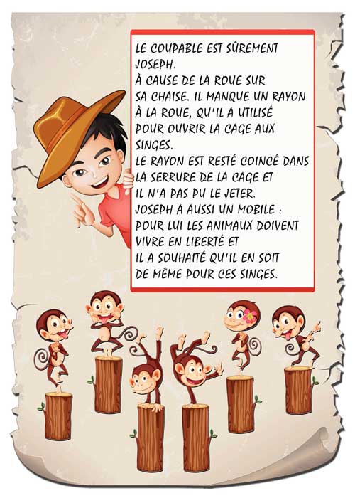 Pendant qu’une classe d’étudiants était en train de visiter le zoo de la ville, des douzaines de singes sont apparus parmi eux. quelqu’un les a libérés. Aide le détective à trouver de qui il s’agit.