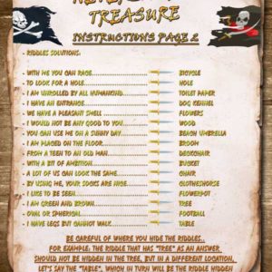 Your child will need to solve riddles, look for clues indoors (house) and write down the answers in the specified points on the map.The first letters of each answer will make up the word that will lead them to the treasure.
