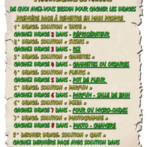 Votre enfant devra résoudre les énigmes, chercher des indices à l'intérieur ou le jardin et reporter les solutions aux points indiqués sur la carte. Les premières lettres de chaque solution forment le mot qui l'amènera à la cachette du trésor.