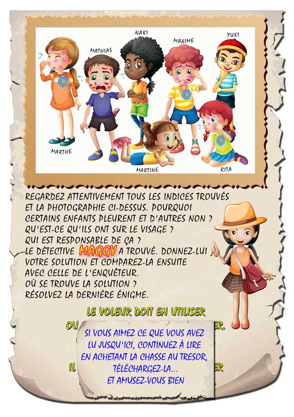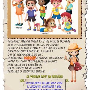 Tout cela à travers la lecture d’une histoire, d’énigmes simples et amusantes et d’images qui sont autant d’indices nécessaires pour résoudre l’affaire.