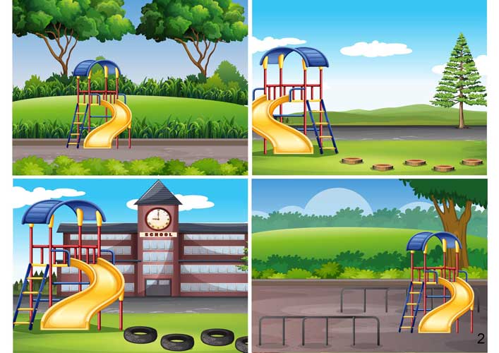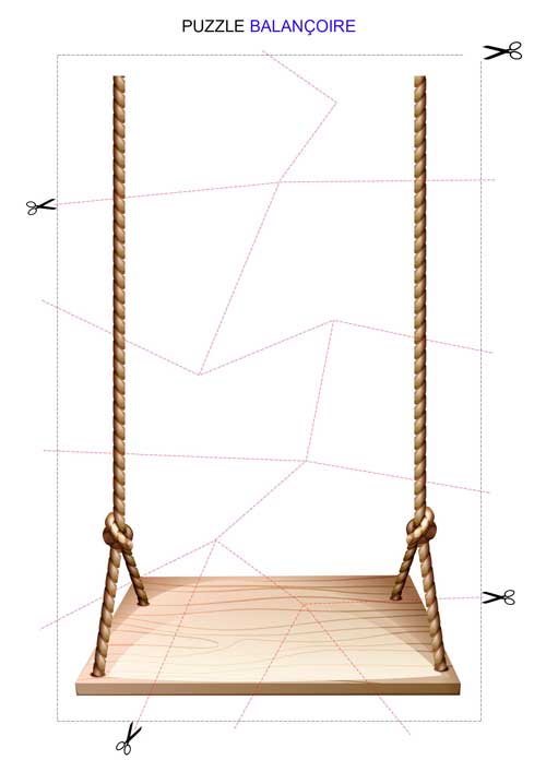 Devinettes : Balançoire – Cabane – Cheval à bascule - Buisson - Poubelle - Réverbère - Pneu - Banc - Ballon – Cage de football – Clôture/barrière - Escalier - Table - Toboggan - Arbre