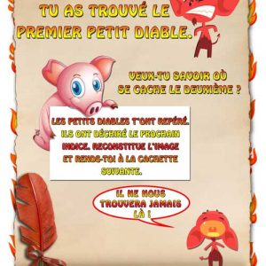 Version pour enfants 8-10 ans. Des petits diables ont caché un trésor. Votre enfant devra trouver ces petits diables à travers la résolution d’énigmes sympas et amusantes pour arriver au trésor.