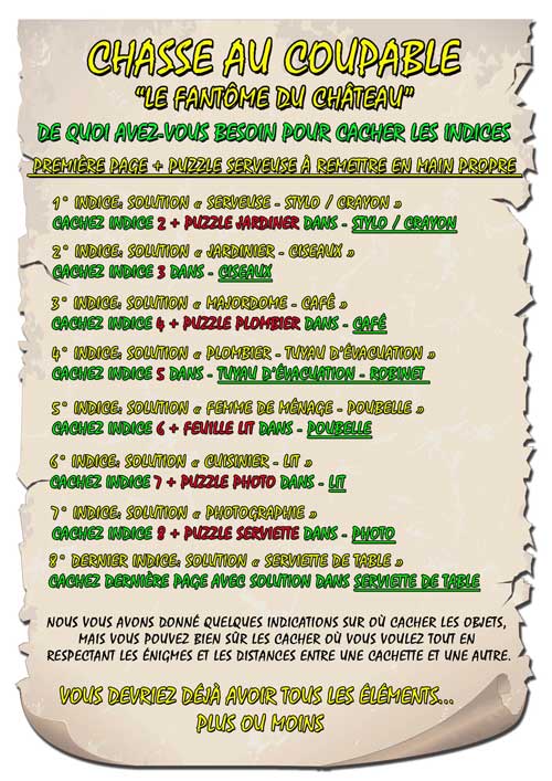 Votre enfant devra résoudre les énigmes, chercher des indices à l'intérieur ou le jardin et reporter les solutions aux points indiqués sur la carte. Les premières lettres de chaque solution forment le mot qui l'amènera à la cachette du trésor.