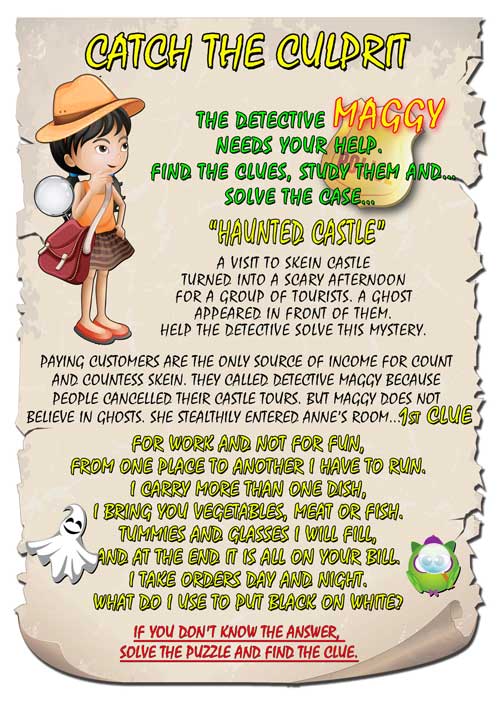 Maggy the detective and your child are asked to investigate a case in which everyone is a suspect but only one person is guilty. They have to solve riddles that will lead them to discover and examine clues (images), carefully study the people involved and finally draw conclusions from their discoveries to find the culprit.