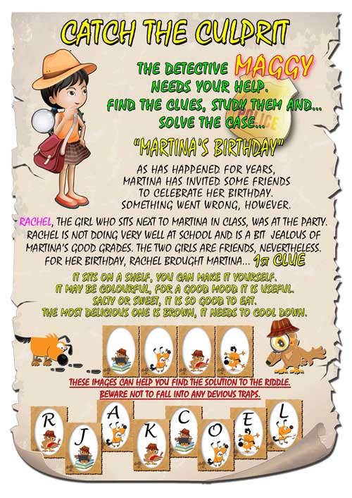 Maggy the detective and your child are asked to investigate a case in which everyone is a suspect but only one person is guilty. They have to solve riddles that will lead them to discover and examine clues (images), carefully study the people involved and finally draw conclusions from their discoveries to find the culprit.