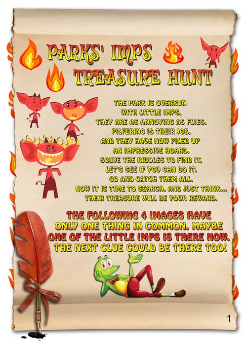 The Park is overrun with little imps, they are as annoying as flies. Pilfering is their job, and they have now piled up an impressive hoard. Solve the riddles to find it/ them let’s see if you can do it. Go and catch them all now it is time to search, and just think… their treasure will be your reward.