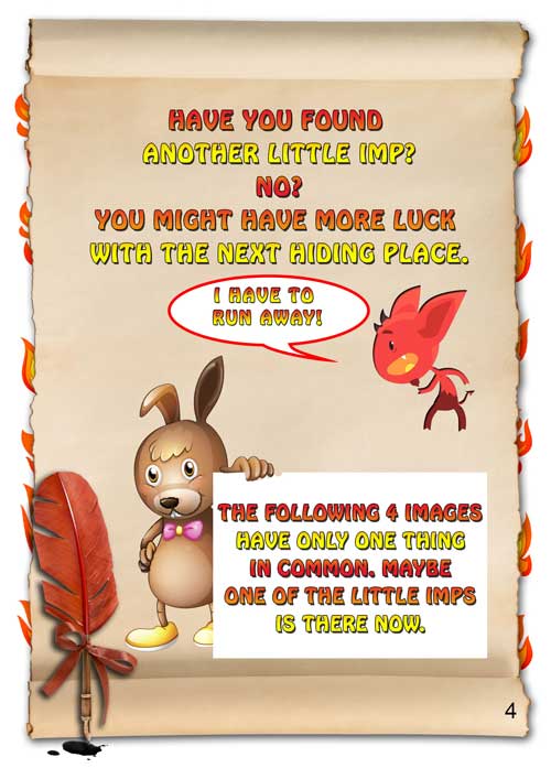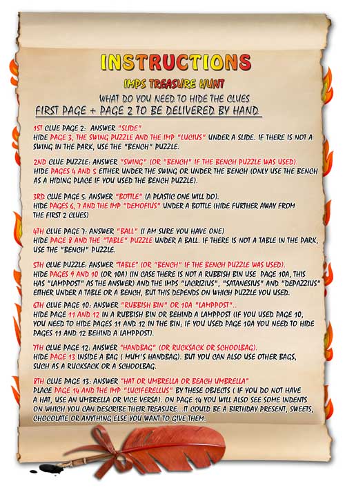 The Park is overrun with little imps, they are as annoying as flies. Pilfering is their job, and they have now piled up an impressive hoard. Solve the riddles to find it/ them let's see if you can do it. Go and catch them all now it is time to search, and just think... their treasure will be your reward.