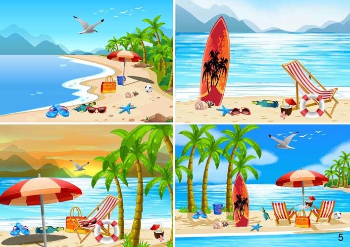 Riddles : Beach umbrella - Flip-flops - Hole - Sunglasses - T-shirt - Hat - Towel - Ball - Rubbish bin - Bucket - Deckchair