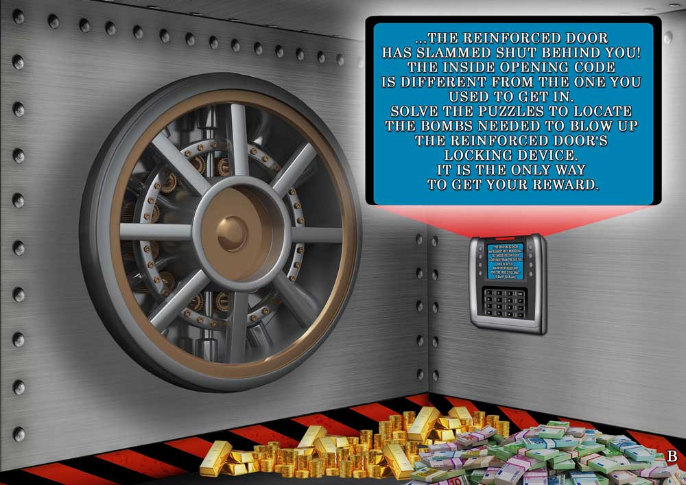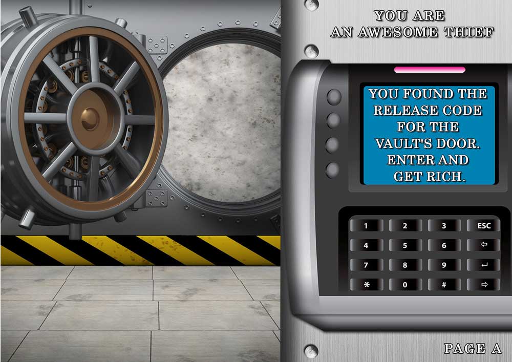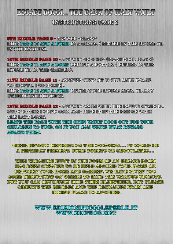 Version 8-10 years old. Your child is an awesome thief. He managed to find the release code for "Bank of Italy Vault". But once inside, the reinforced door slammed shut behind him. Because the outside release code is different from the inside one.....How can he escape? How can he enjoy his loot? That's easy.... by solving the riddles he will figure out the new code's numbers. They are suitable for birthdays, parties and special occasions or simply to pass the time.