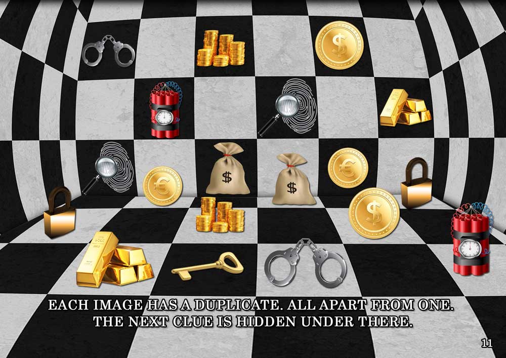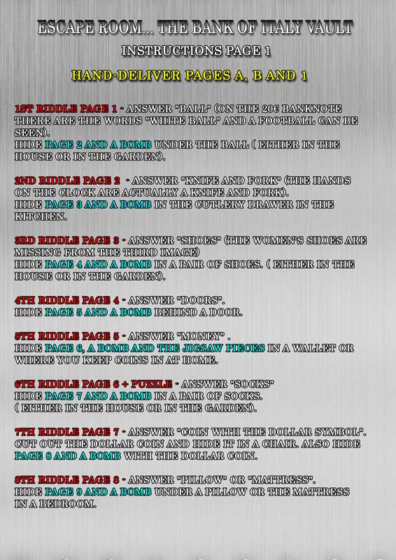 Version 11-13 years old. Your child is an awesome thief. He managed to find the release code for "Bank of Italy Vault". But once inside, the reinforced door slammed shut behind him. Because the outside release code is different from the inside one.....How can he escape? How can he enjoy his loot? That's easy.... by solving the riddles he will figure out the new code's numbers. They are suitable for birthdays, parties and special occasions or simply to pass the time.