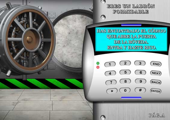 Tu hijo es un ladrón formidable. Porque ha logrado encontrar el código para abrir la "Bóveda del Banco de Europa ". Pero una vez entrado, la puerta de seguridad se ha cerrado detrás de él. Dado que el código de apertura externo es diferente al interno ... ¿Cómo salir ahora? ¿Cómo disfrutar del botín? Simplemente resolviendo los acertijos que llevarán a encontrar los números del nuevo código.
