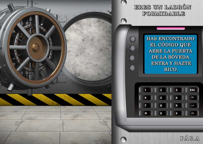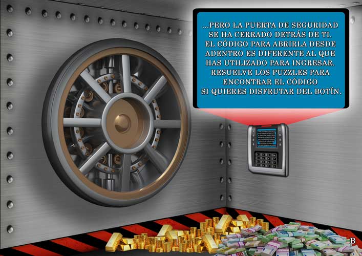Tu hijo es un ladrón formidable. Porque ha logrado encontrar el código para abrir la "Bóveda del Banco de Europa ". Pero una vez entrado, la puerta de seguridad se ha cerrado detrás de él. Dado que el código de apertura externo es diferente al interno ... ¿Cómo salir ahora? ¿Cómo disfrutar del botín? Simplemente resolviendo los acertijos que llevarán a encontrar los números del nuevo código.