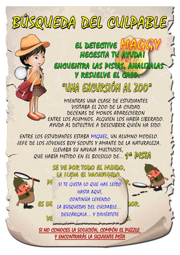 El detective Maggy y vuestro hijo tendrán que investigar casos en los que todos son sospechosos, pero solo una persona es culpable. Deberán resolver los acertijos componer puzzle y palabras que les llevarán a descubrir y examinar las pistas (imágenes), estudiar con atención a las personas implicadas y al final sacar conclusiones de todo lo que han descubierto y encontrar al culpable.